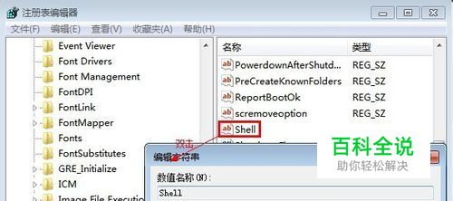 双击Shell项,弹出“编辑字符串“对话框,将”数值数据“一项值改为explorer.exe。如图: