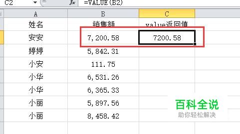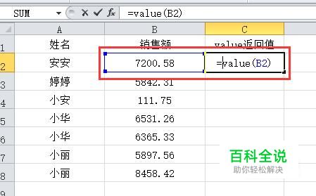 在“value的返回值”下面的单元格中,输入公式“=value(B2)”。