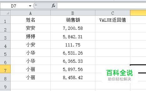 首先,打开excel表格,如图可以看到,销售额都是字符串数字,我们利用value将其转换成纯文本数字。