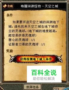 完成“消灭天空的深渊怪物”之后就会有换破魔石的任务。可以用八张邀请券换一块火焰破魔石,当你拥有火焰破魔石的时候去打天空之城就可以选择开启深渊模式开始刷深渊了。