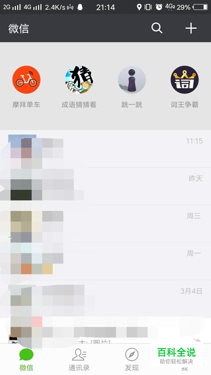 打开微信,在“微信”界面向下滑,找到并打开“摩拜单车”小程序。