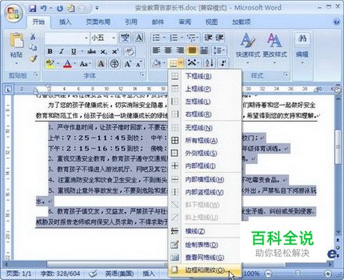 打开Word 2007文档窗口,在“开始”功能区的“段落”分组中单击“边框”下拉三角按钮,并在打开的菜单中选择“边框和底纹”命令,如图所示。 选择Word 2007“边框和底纹”命令