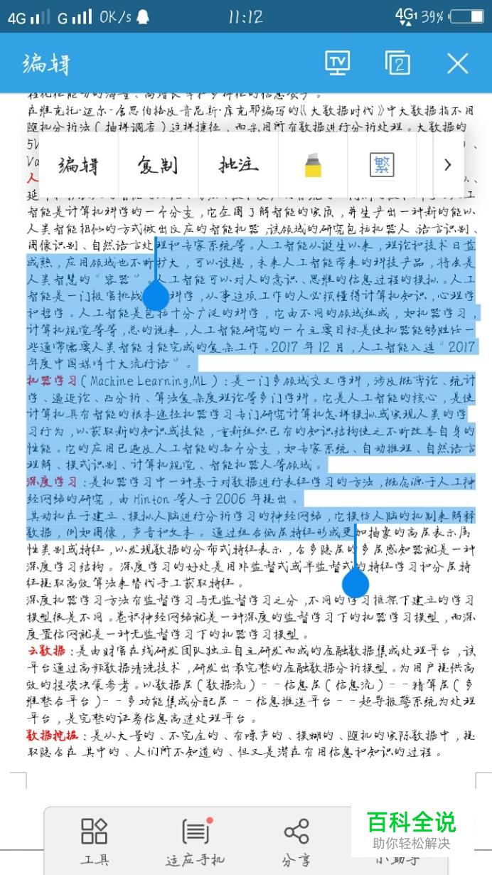 如果不需要编辑的话,可以直接在查看界面,长按屏幕,然后拖动两边的球球到需要位置,即可实现全选