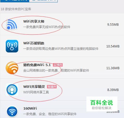 首先下载一个软件,如下图所示圈点的这些软件都可以开WiFi热点。小编下载的是“WiFi共享大师”。