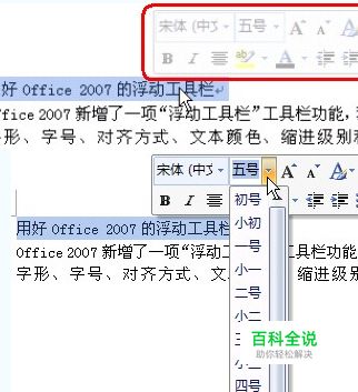 Office 2007新增了一项“浮动工具栏”功能,我们能非常方便的在“浮动工具栏”中进行字体、字形、字号、对齐方式、文本颜色、缩进级别和项目符号等设置。