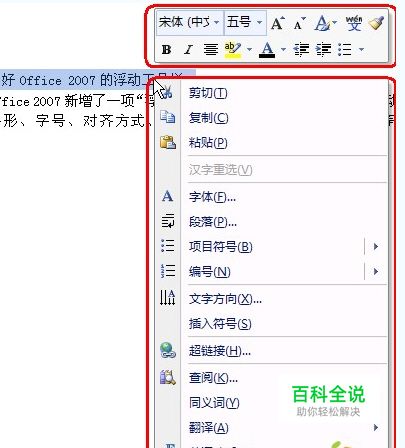 其实这个浮动工具栏中的项目几乎就是我们选中文本后右键单击弹出的快捷菜单中的内容,但在Word 2007中使用右键单击时在弹出的快捷菜单上面也会显示出“浮动工且栏”,不过这样使用“浮动工具栏”就多做了一步右键单击的操作了。