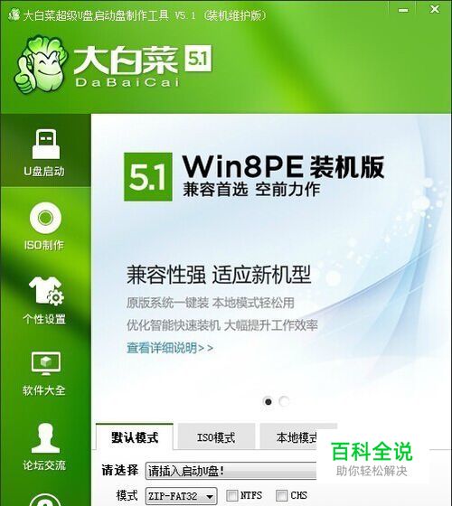 第一步:先制作一个U盘启动盘,首先,下载安装一个“大白菜U盘启动”软件,打开后,界面会有显眼的“一键制作”按钮,直接点击制作。