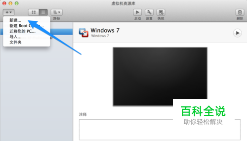 打开 Vmware Fusion 以后,在虚拟机资源库中,点击左上角的 “+”按钮,再点击“ 新建”选项,如图所示