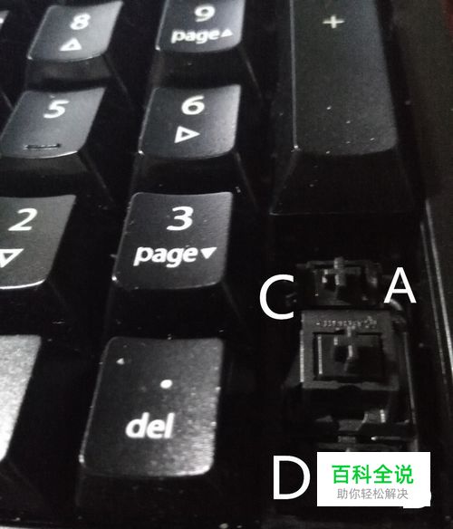 之后用拔键器拔出大键的键帽,最好将它周围的键帽也拔出来,如下图:拔出3和del键的键帽,用一字螺丝刀往上撬A点,然后B点,之后往右撬C点,再往右撬D点,取出两个小轴(小轴本身是没有弹性的,只是起支撑的作用),取出来的小轴非常松,这是正常的。