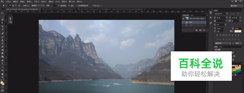 首先,我们使用photoshop开启需要处理的文件,可以看到, 文件图片出现在photoshop的工作区,我们处理图片使其变为“天空,山,水”三个区分的素材。