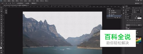 将天空和水面都成功提取后,将原始图片的图层蒙版进行涂黑,即可隐去“天空”以及“水面”,这样“山体”就会自动出现,进行独立保存,即可获得三个素材。