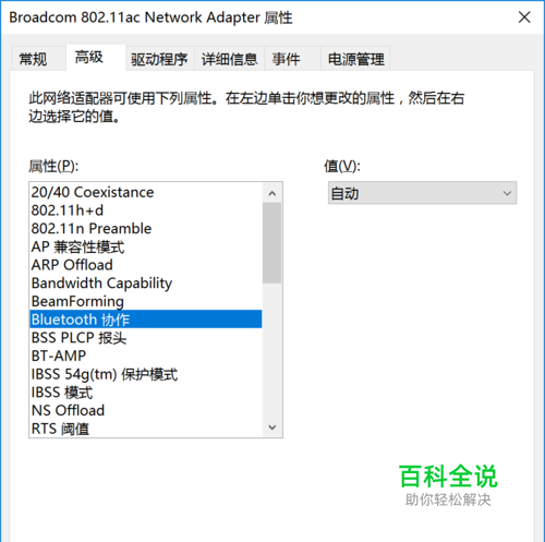 在属性页面,打开 配置 ,选择 -高级 。 在列表里面找到-Bluetooth协作。 改成自动。