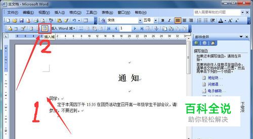 先把光标定位到1处需要插入域的位置,单击2处的“插入域”按钮。