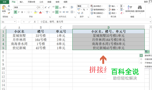 完成拼接小区名、楼号、单元号的拼接。 我们可以在D2:D5中看到拼接小区名、楼号、单元号的结果。