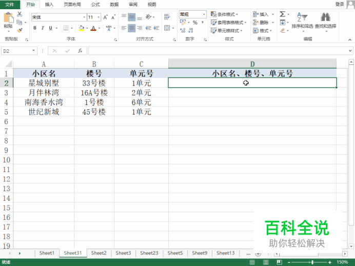 得到拼接小区名、楼号、单元号的第一个结果。 按下回车键Enter即可在D2单元格内得到拼接小区名、楼号、单元号的第一个计算结果。