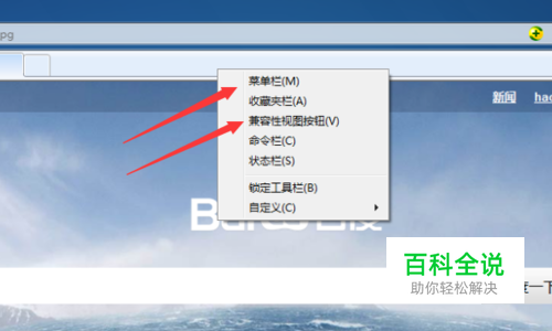 在使用ie的浏览器,菜单栏中是无显示的,需要进行打开,右键菜单栏,弹出下拉的菜单中,勾选上“菜单栏”和“兼容性视图按钮”。