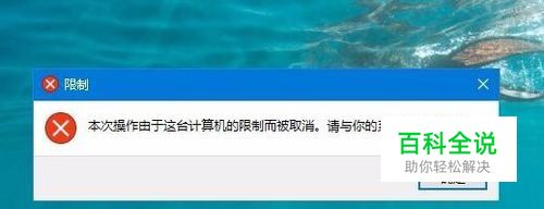 在Windows10系统下打开控制面板的时候,提示“本次操作由于这台计算机的限制而被取消。请与你的系统管理员联系”窗口,出现这个限制窗口时我们点击确定按钮。