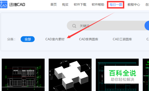 进入到CAD图纸网站后,再一次移动鼠标点击官网的“每日一图”这个栏目,然后会出现许多的图纸,有“CAD室内素材”、“CAD家具图库”、“CAD工装图库”等一下dwg格式的图纸。