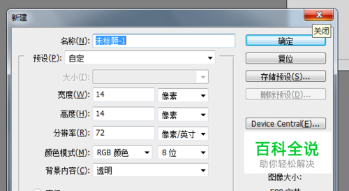 打开PhotoShop,Ctrl+N 新建一个图层, 设置大小:14x14, 图片格式:png