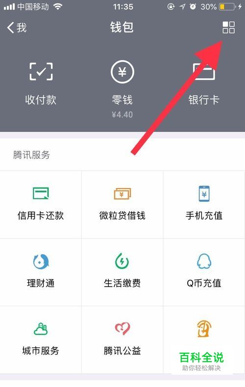 首先讲微信,打开微信——钱包,点击进去,如下图,点击右上角的符号。
