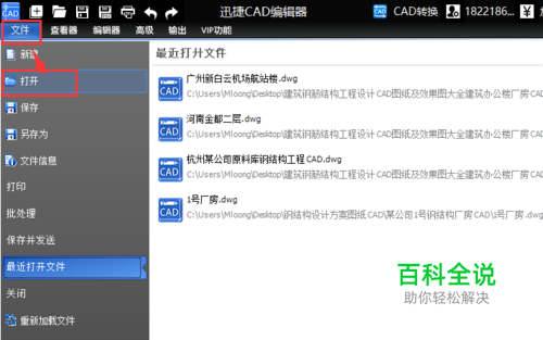 打开编辑器,点击“文件”选项,在点击“打开”按钮,在弹出的“打开”对话框将需要进行编辑的CAD图纸文件打开。