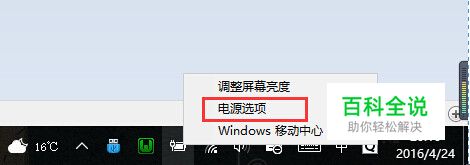 找到屏幕下方右侧任务栏中的电池小图标→右键→单击电源选项