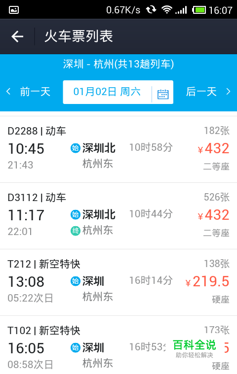 可看到有很多时刻列车选择。看好哪个时间段的车合适,就点击哪辆列车。