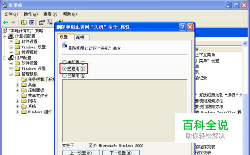 点击属性后就打开如下图所示的删除和阻止访问关机命令 属性对话框,我们可以看到对该功能是启用的,所以我们看不到关机菜单,现在我们要做的就是关闭这个功能