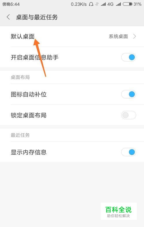 进入桌面与最近任务后,可以看到第一栏的默认桌面选项,点击即可进入其设置。