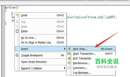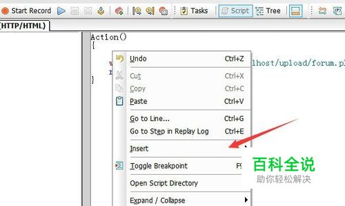 在loadrunner的脚本代码中使用web_url的参数进行对访问一个论坛信息,在这个参数上一行中进行右键的方式,弹出的下拉菜单中进行选择“insert”。