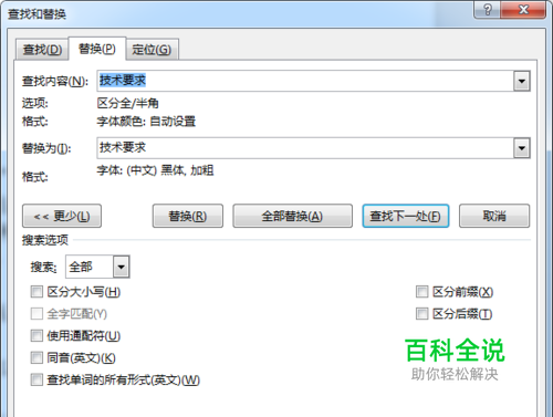 “查找内容”、“替换为”输入框内,输“[所要替换的重复字段]”。 比如:在我提供的示范文段中,我想要黑体加粗显示“技术要求”四个字,那么就在两个输入框内都输“技术要求”。(见图2)