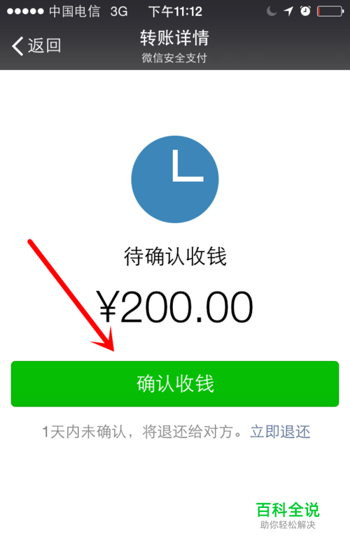 点击信息,查收,点击“确认收钱”。界面如图所示。