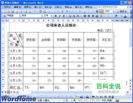 Word2003表格具有简单的计算功能,可以借助这些计算功能完成简单的统计工作。例如可以使用Word2003表格计算出某个部门一周内接待了多少人次来访者,以及一个工作日公司一共接待了多少人次。用Word2003表格计算数据的步骤如下所述: