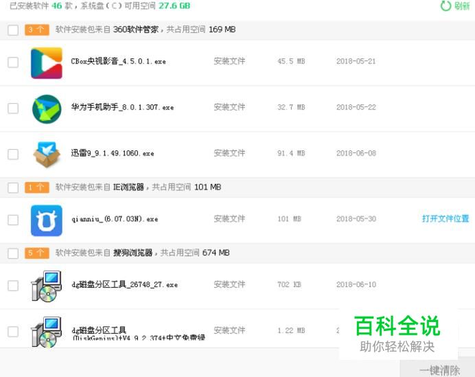 在后边就会列出电脑里的安装包,从中选择不需要的打钩,然后点下边的“一键清理”就可以了。