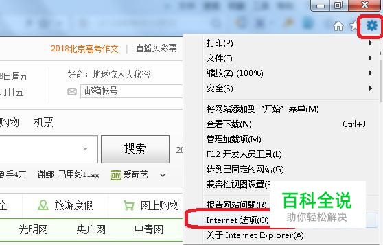 第一种方法,打开浏览器,如图所示,找到浏览器的“设置”按钮,在下级菜单中调出“internet选项”。