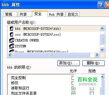 打开服务器系统的资源管理器窗口,找到D盘下面的“aaa”目录,然后用鼠标右键单击该目录窗口中的子文件夹“bbb”,并执行右键菜单中的“属性”命令,打开B部门信息上传目录的属性设置窗口,单击该设置窗口中的“安全”标签,再在该标签页面中单击“添加”按钮,从弹出的“选择用户或组”列表中将“bbb”用户帐号选中,再单击“确定”按钮返回到安全标签设置页面(如下图所示), 并在该页面中赋予“bbb”用户帐号合适的访问权限。之后在下图界面中选中Everyone帐号名称,并点击“删除”按钮,以便取消其他员工对“bbb”文件夹的访问权限,最后单击“确认”按钮结束“bbb”上传目录的访问权限。 按照相同的设置操作步骤,我们再将信息上传目录“ccc”的安全权限只授予“ccc”用户帐号,如此一来我们就顺利完成了对B部门、C部门所管理的信息上传目录共享权限间的相互限制了。