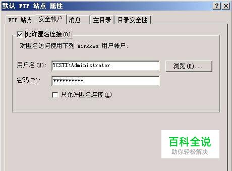 打开Internet信息服务窗口,在该窗口的左侧显示区域,用鼠标右键单击目标FTP站点,从弹出的快捷菜单中单击“属性”命令,打开目标FTP站点的属性设置窗口,单击该窗口中的“安全帐号”标签,进入到标签设置页面(如下图); 检查该标签页面中的“允许匿名连接”项目是否处于选中状态,要是发现该选项已经被选中的话,那我们必须及时取消它的选中状态; 单击上图中标签页面中的“浏览”按钮,从随后出现的“选择用户或组”设置窗口中,依次将“bbb”、“ccc”用户帐号选中并导入进来,再单击“确认”按钮,返回到Internet信息服务列表窗口;