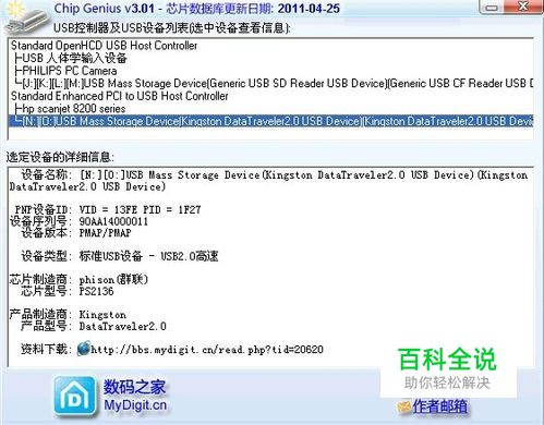 下载芯片检测软件chipgenius,插入u盘后运行chipgenius,出现如图界面本例中的u盘为8G金士顿U盘,检测结果是群联PS2136芯片,VID=13FE,PID=1F27。上网搜索下载群联量产工具软件,本例所用为Phison UP13UP14UP12量产工具。