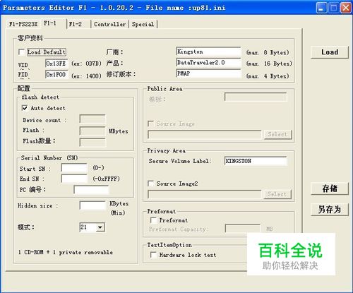 首先运行ParamEdt-F1-v1.0.20.2.exe,出现如下界面点F1-1,出现图示画面,把刚刚检测到的参数填上,模式一栏选择3为量产为单个U盘,21为量产为一个CD-ROM加一个U盘,还可以量产为加密区和通用区等很多种选择,常用的是3和21。当想把量产成多区的U盘重新量产时,必须先用模式3量产成单U盘后才能再量产为多区U盘。本页填好后点F1-2,在CD-ROM项填入系统安装盘映像的路径,如图示然后点controller,在select空里填上F1_90_v196_00.exe,点存储,起个名(本例为up8.ini),退出。
