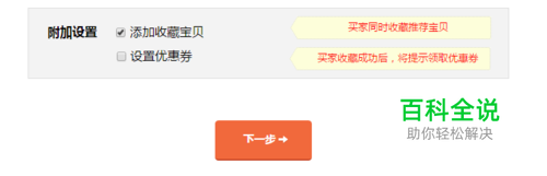 点击勾选添加收藏商品,活动展示过程中,客户领取流量时需要先收藏店铺和一个商品,优惠券可自定义设置,每次可设置1-3张不同金额的店铺优惠券,然后进行下一步!