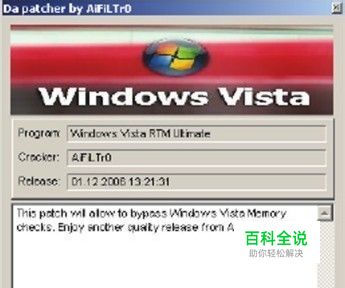 二、安装实战 下载Windows Vista内存容景免检测补丁后,接下来执行如下的操作: 1、将Windows Vista安装光盘屮的所有内容复制到硬盘屮,如F:Vista目录。 2、将下载的Windows Vista内存容景免检测补T解压,得到vista」iomem.exe这个文 件。双iif运行此文件后,在打开的窗口屮单击“Ciack”按钮,如图2所示。