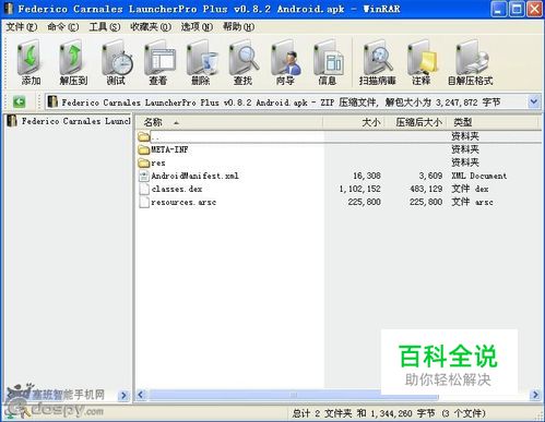 apk安装包的文件结构 以知名桌面软件“LauncherPro”为例,apk安装包文件目录如下图: 文件目录如下: - META-INF - res - anim - color - drawable - drawable-hdpi - drawable-land - drawable-land-hdpi - drawable-mdpi - drawable-port - drawable-port-hdpi - layout - layout-land - layout-port - xml - AndroidManifest.xml - classes.dex - resources.arsc - 多数情况都要汉化的是resources.arsc、classes.dex和res文件夹里的***.xml文件。 - META-INF文件夹里面存放的是证书文件,软件修改后需要将里面的证书文件删除(***.RSA、***.SF、***.MF三个文件)再重新签名,否则软件无法安装。 - res文件夹里存放的大部分是软件所需的资源及布局文件(drawable存放资源、layout、xml存放布局文件***.xml),部分需要汉化的单词、语句会在这些***.xml文件里。 - AndroidManifest.xml文件里包含了软件名称、版本、权限、引用的库文件等信息。极少数软件在这个文件里会有单词、语句需要汉化。 - classes.dex文件是Java源码编译后的代码文件。通常该文件里都有单词、语句需要汉化。 - resources.arsc文件是编译后的资源文件,大多数情况下,需要汉化的单词、语句绝大多数都在这个文件里,汉化的时候首先就要看这个文件。 * 另外,一些需要汉化的***.png图片文件、***.html文件、***.txt文件可能会在assets文件夹或res/raw文件夹内。图片文件需要用Photoshop修改,html、txt文件可以直接用Notepad++ Portable文本编辑工具修改(不建议用系统自带的记事本,这东西杀伤无数...)。