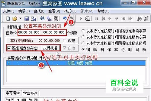 先来制作第一句字幕。在时间校准下面设置字幕的显示和消影时间,设置好时间后在界面下方输入字幕的内容,接着勾选“校准后立即存盘”,再点击“执行校准”。