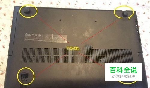 二、另外在联想Z500笔记本后壳的四个坐垫中还藏有4颗固定螺丝,我们需借助小针,先翘出四个坐垫,然后再使用十字螺丝刀拆卸这四个隐藏的固定螺丝,如下图所示。