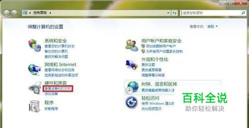 点击“开始”→“控制面板”→“查看设备和打印机”,如下图所示;