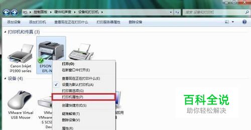 找到您所安装的打印机图标,鼠标右键,点击打印机属性,如下图所示;