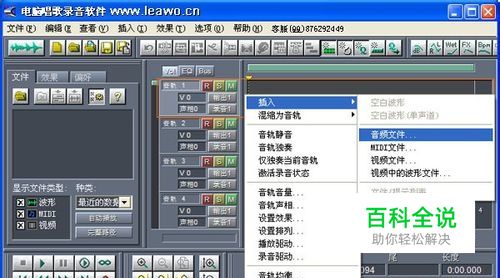 打开录歌软件,如下图所示,默认界面上有四个音轨(音轨1、音轨2、音轨3和音轨4),我们将用音轨1放伴奏,音轨2录音。OK,点击音轨1,右击音轨1空白处,下拉菜单中选择“插入”-“音频文件...”。