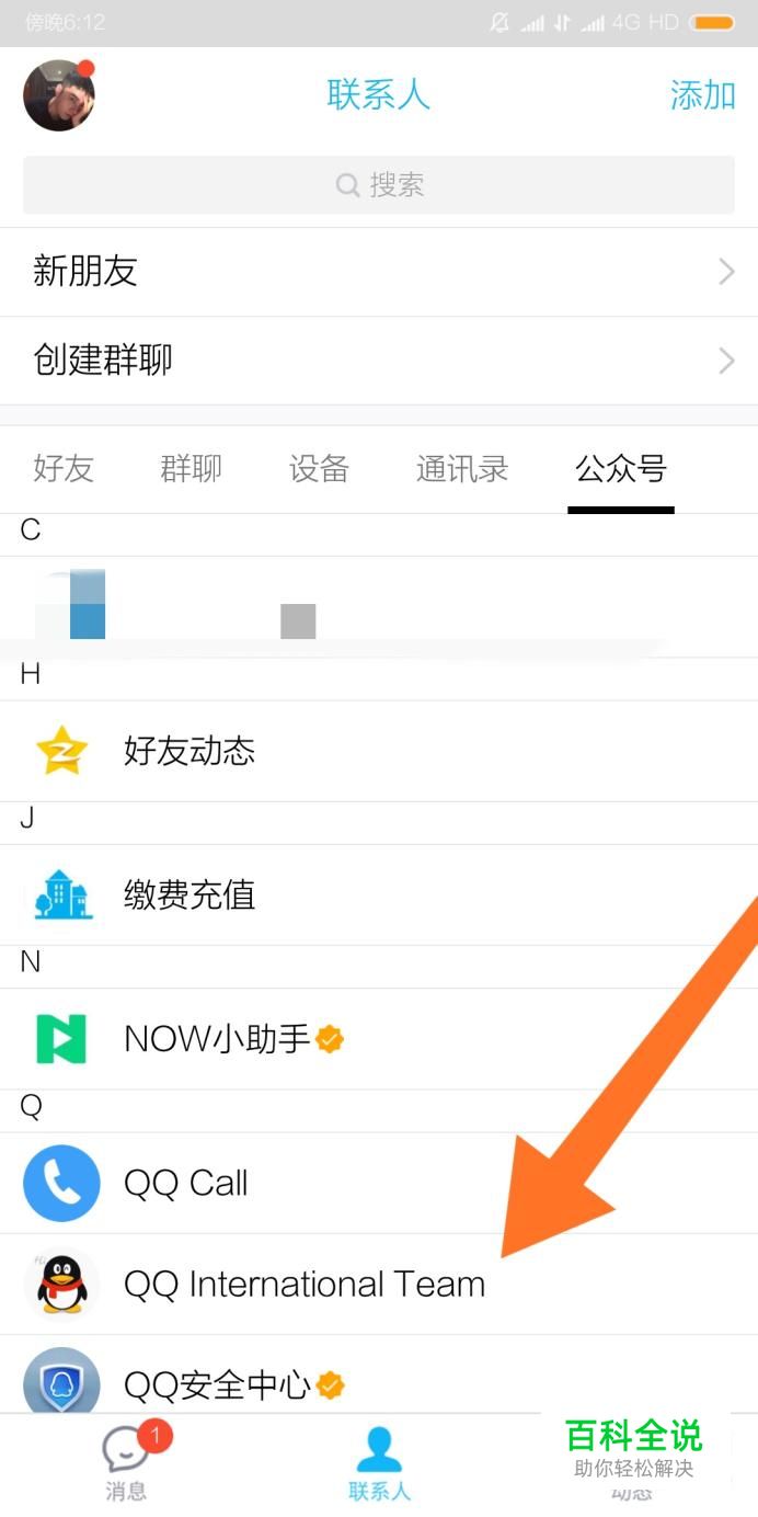 首先进入手机QQ联系人页面,点击需要取消关注的公众号。