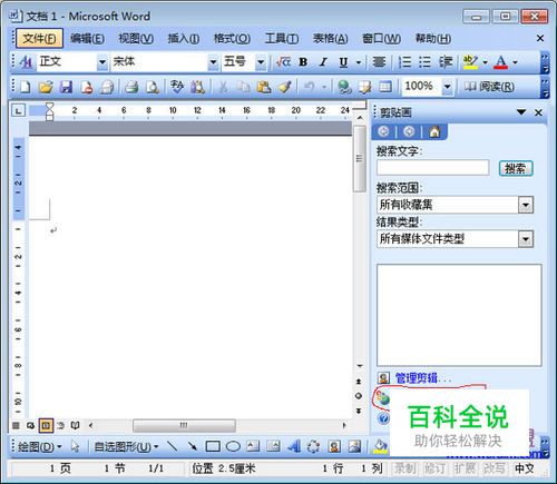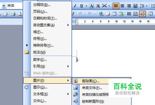 打开Word,单击菜单栏的“插入”-->图片-->剪贴画;