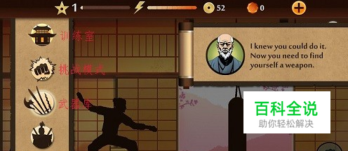 MENU面板第一个图标是进入训练室;第二个是挑战模式,进入之后可以选择相应的“关卡”来和各个忍者进行战斗;第三个是武器库。